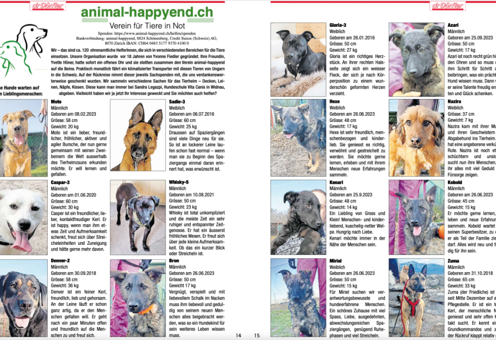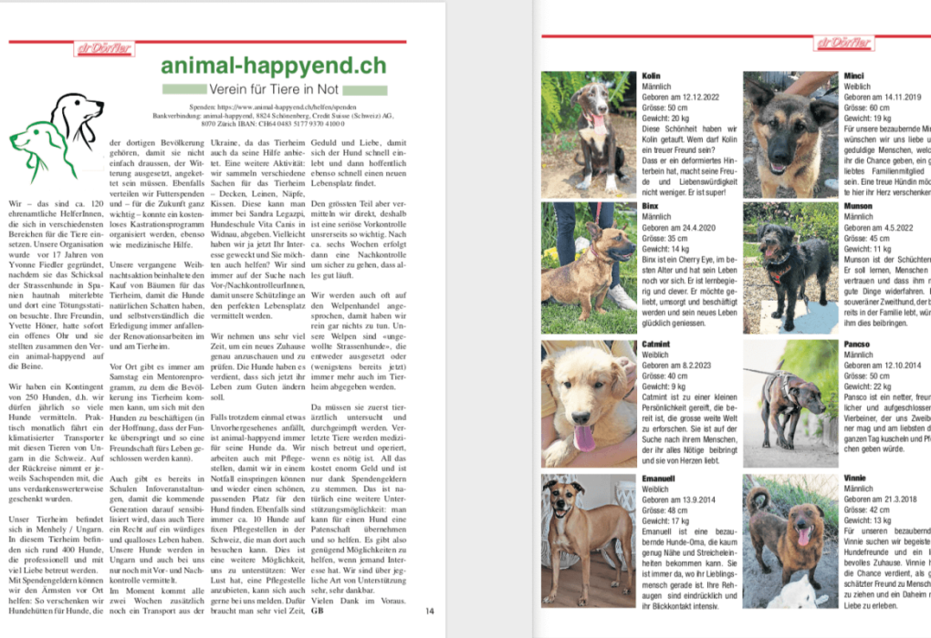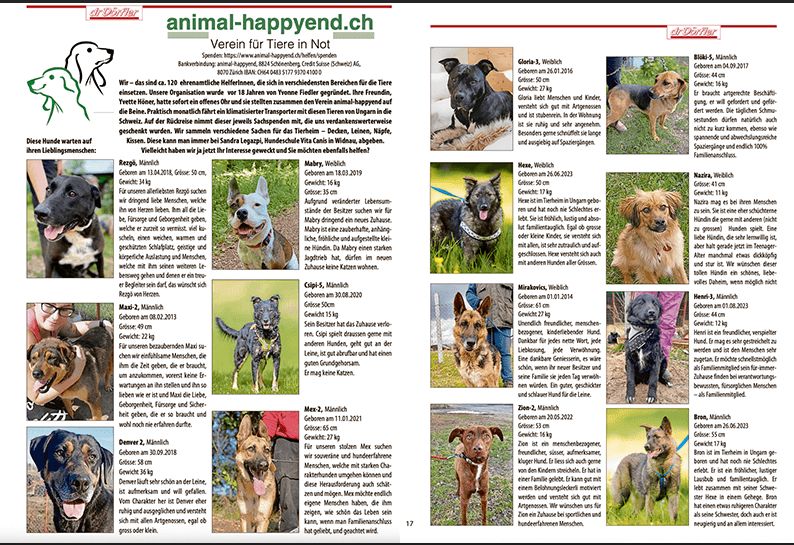 Eine Reportage über animal-happyend und eine Seite Inserate von Hunden, welche von uns ein Zuhause suchen.